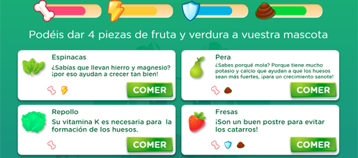 Registra en tu área privada cuántas piezas de fruta y verdura llevan cada día tus alumnos al colegio para comer en el recreo... ¡Cuantas más piezas, más y mejor evolucionará su mascota virtual!